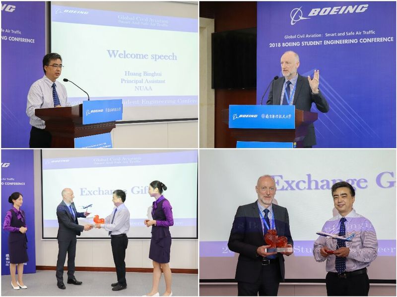 开幕式上,黄炳辉对波音公司的信任与支持表示感谢,对来自各大高校的与会者表示欢迎,并对南航大与波音公司的长期合作做出了展望。波音(上海)航空服务有限公司总裁Dermot Swan先生为本次大赛致辞,他表达了对本次活动组织者和承办者的感谢,阐述了波音公司在民航发展中做出的努力,并激励学生成为更好的自己。Dermot Swan先生和黄炳辉代表校企双方共同互赠礼物,希望双方共同建立更深厚的友谊。
