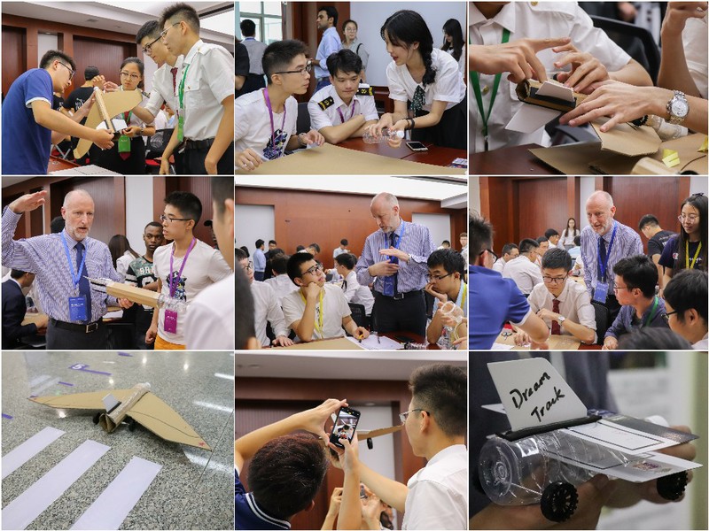在会议室外的一处模拟机场跑道的场地上,所有参会的学生代表分成A—G七组,使用主办方提供的硬纸板、塑料轮、空塑料瓶等材料大开脑洞,动手制作飞机模型。