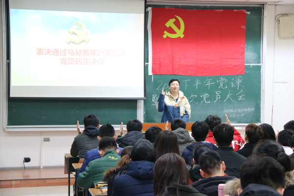 会议伊始,党支部书记杨靖宇同志宣读了预备党员转正名单,由到会的的党员对以上同志的表现进行考核,判断其入党动机是否端正,个人表现是否符合党员标准,并进行了举手表决。最终,马赫男等21名预备党员均通过了考核,成为了正式党员。当然,成为一名党员是一种荣誉,更是一份责任。希望加入极速电竞 15级党支部的新鲜血液能够不忘初心,继续认真学习党的纲领和章程。在学习生活中,以党员的身份严格要求自己,为其他同学做出表率。