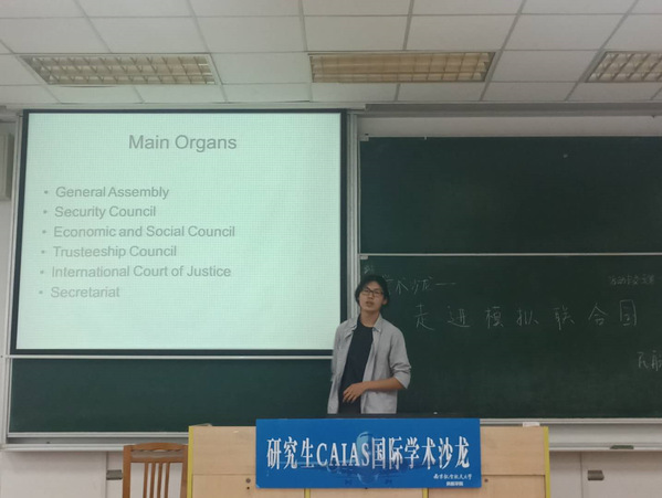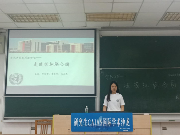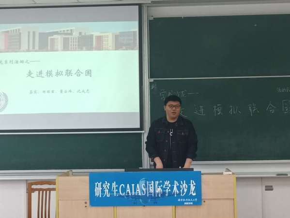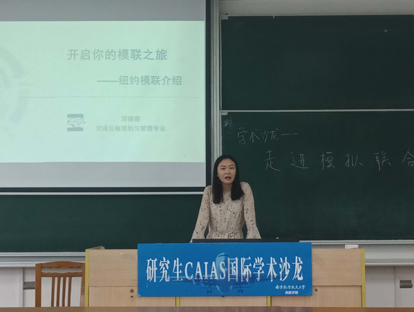 5月20日下午,极速电竞 研究生会在将军路校区6号楼举办主题为“走进模拟联合国”第八期CAIAS国际学术沙龙。本次活动邀请有着丰富的模拟联合国经验的郑丽君、董云炜和沈成志三位嘉宾做分享,他们于今年3月代表南航参加纽约模拟联合国活动,极速电竞 硕士研究生、博士研究生参加了本次活动。
