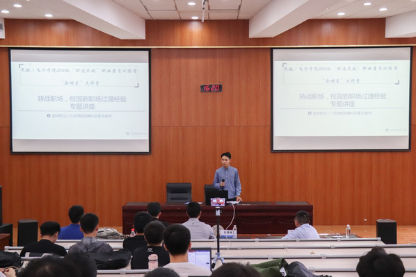 2019年5月23日下午,极速电竞 2016级开展了“职通民航”职业素质培训营中“企明星”大讲堂系列活动。本次活动邀请了吉祥航空人力资源部招聘组经理田崇伟先生,与极速电竞 校友吉祥航空运力网络部的孔彪先生,为同学们开展主题为“转战职场,校园到职场过渡经验”的专题讲座,从如何做好职业规划、面试技巧与时间管理三个方面详细阐述。