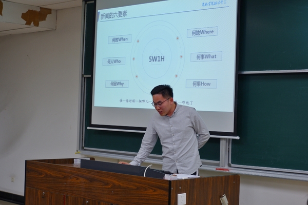 活动伊始,董力通过抛出“新闻是什么,它的定义为何?”这一问题,围绕新闻的基本特征、必备要素、分类,以及新闻稿的结构等方面展开了详细的介绍。在新闻的基本分类中,他重点讲解并举例说明了消息与新闻的特点及区别。除此之外,他还用大量的实例介绍了新闻稿 “标题、导语、主体、结尾、背景”等五个部分,为同学们点明了各部分内容的重要性与相互之间的联系,详尽地介绍了写作的形式和要点。最后,董力以“勤于思索,工于动笔”作为寄语,鼓励同学们多思考多动笔。