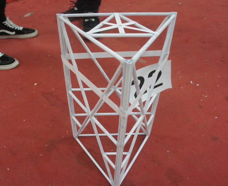 比赛当天,来自不同电竞 、不同年级的31支加载组队伍都信心满满地带着自己用A4纸精心制作的结构模型来到比赛现场等待加载,12组模型组精美制作的模型也已经陈列在舞台上等待检验了。在31组加载组队伍中,有一支是来自天目湖校区的同学。今年的加载组的赛题较去年有一些变化,由原来的三层结构变成了两层结构,并保持模型高度为500mm(±10mm),质量≤300g。最终,自重199.1g、高度500mm的模型以顶层承重201.65kg的成绩拿下比赛加载组的特等奖,结构能效比再创新高。