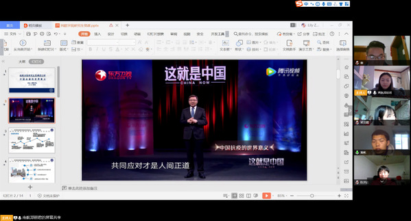 郑丽君以张维为教授的主题演讲《中国抗疫的世界意义》视频为切入点,从“中国的防疫举措是有效的,值得全球借鉴”、“各国共同抗疫才是正道”和“中国特色社会主义制度的显著优势”三个方面和大家分享了自己关于国家在新冠肺炎疫情防控中实施的一系列举措的感受。通过对比美国应对甲型流感和当下我国应对疫情的情况,阐明了坚持和完善中国特色社会主义制度的重要性和必要性。