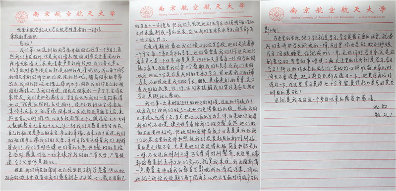 近日,电竞 党委收到了2017级第一批外送飞行学员在南非奥尚基地写给电竞 党委的一封家书,感谢疫情期间电竞 和电竞 给他们给予的指导和关心。他们表示,虽然南非已经出现51例患者,但有电竞 和电竞 的作为强大后盾,同学们的不安和担心少了许多。