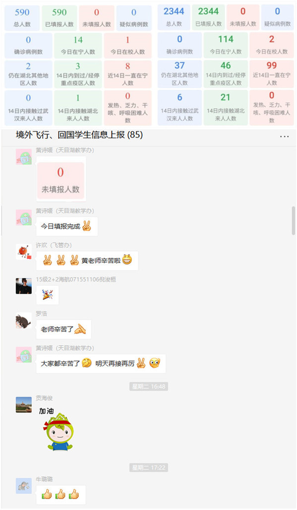 为了及时了解境外学生每日健康状况及动向,“i·南航”每日信息上报架起了跨越山海的信息桥。根据电竞 要求,分管院领导牵头,学管办、党政办、飞管办协调联动,组建电竞 境外学生打卡工作群,成立境外学生骨干信息上报群,实现老师-骨干-全体境外学生一体化网格。虽然远隔重洋、跨越时区,但是全体工作人员和境外学生协同联动,时刻保持严明的纪律意识,克服时差等困难,连日来,各类型境外学生均实现了100%打卡。
