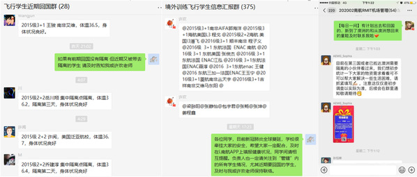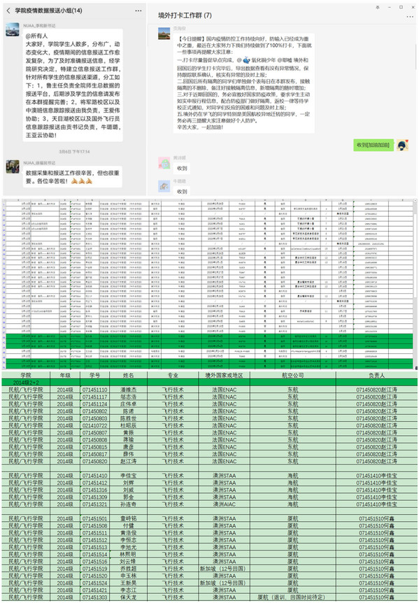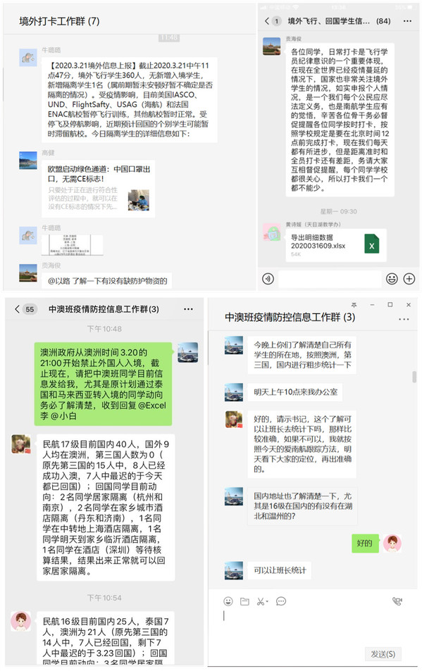 由于学生培养的特殊性,除交换生外,民航/飞行电竞 飞行技术专业学生及机场运行与管理(中澳合作办学)学生均需在本科阶段赴境外学习。因此,在境外疫情爆发之初,电竞 就迅速出击,指派专人负责,准确摸排,抓实抓细境外学生疫情防控基本数据,确保防控工作数据准确可靠,在疫情蔓延之后,电竞 党政联席会明确由两位副书记分别负责境外飞行学员和中澳合作办学的境外学生防控工作,强化防控工作落细落实。