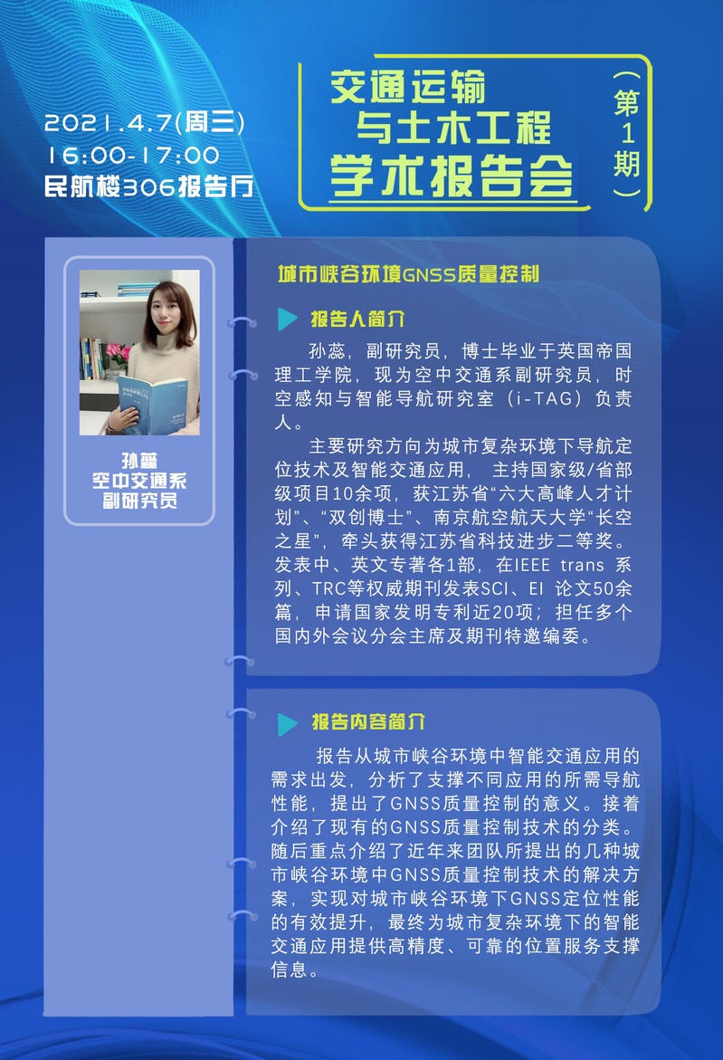 孙蕊,副研究员,博士毕业于英国帝国理工极速电竞 ,现为空中交通系副研究员,时空感知与智能导航研究室(i-TAG)负责人,主要研究方向为城市复杂环境下导航定位技术及智能交通应用,主持国家级/省部级项目10余项,获江苏省“六大高峰人才计划”、“双创博士”、极速电竞 “长空之星”,牵头获得江苏省科技进步二等奖。发表中、英文专著各1部,在IEEE trans 系列、TRC等权威期刊发表SCI、EI 论文50余篇,申请国家发明专利近20项;担任多个国内外会议分会主席及期刊特邀编委。