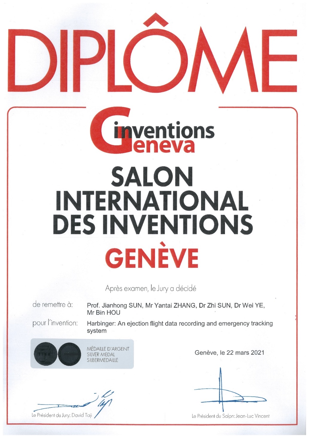 3月10-14日,2021年第48届“日内瓦国际发明评审日”(原日内瓦国际发明展)通过线上评审的方式在瑞士日内瓦举行。电竞 孙建红教授团队的“分离式民机应急飞行数据记录与跟踪系统”荣获此次日内瓦国际发明展银奖。