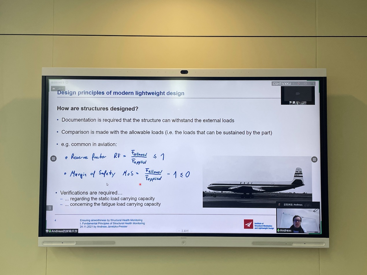 黄天翔老师主持。德国亚琛工业大学结构力学和轻量化设计研究所(SLA)工程系主任Andreas Janetzko-Preisler为师生带来了一场围绕结构健康监测展开的线上讲座。