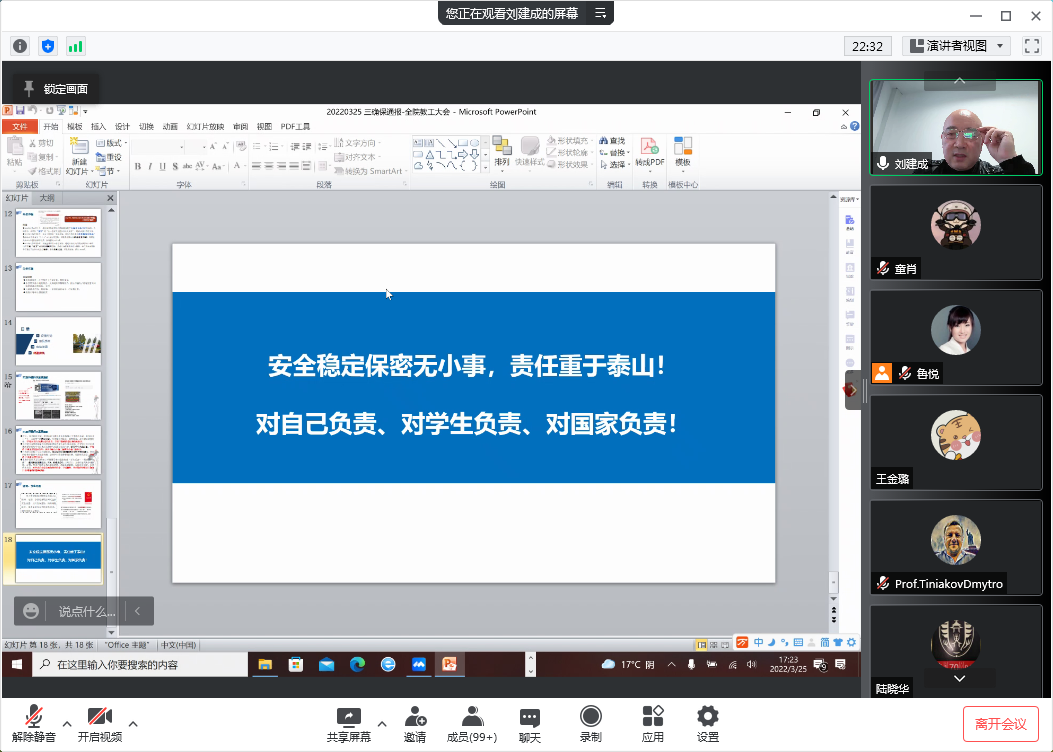 最后,刘建成书记对全体教职工进行“安全、稳定、保密”三确保宣传教育,围绕疫情防控、东航安全事故、电信诈骗和师德师风等方面的问题事件,提醒全体教职工要认真落实电竞 各项防疫政策和制度,强化日常安全管理工作,并重申了党风廉政和师德师风教育的重要性。警示全体教职工对自己负责、对学生负责、对国家负责。