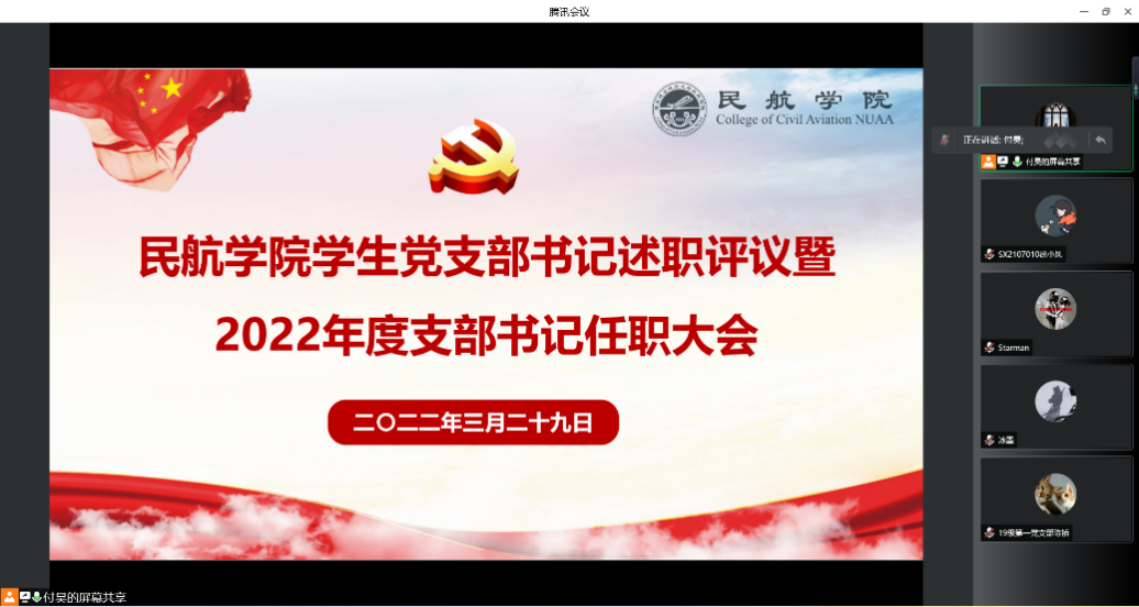 3月29日下午14:30民航楼1214会议室,电竞 2021年度学生党支部书记述职评议暨2022年度支部书记任职大会顺利召开,因疫情防控需要,本次会议采用线上线下相结合的方式进行。电竞 党委书记刘建成、党委副书记王艳、正科级组织员侯美丽以及各学生党支部书记线下参加会议,各学生党支部支委会其他成员线上参会。会议由电竞 辅导员付昊主持。