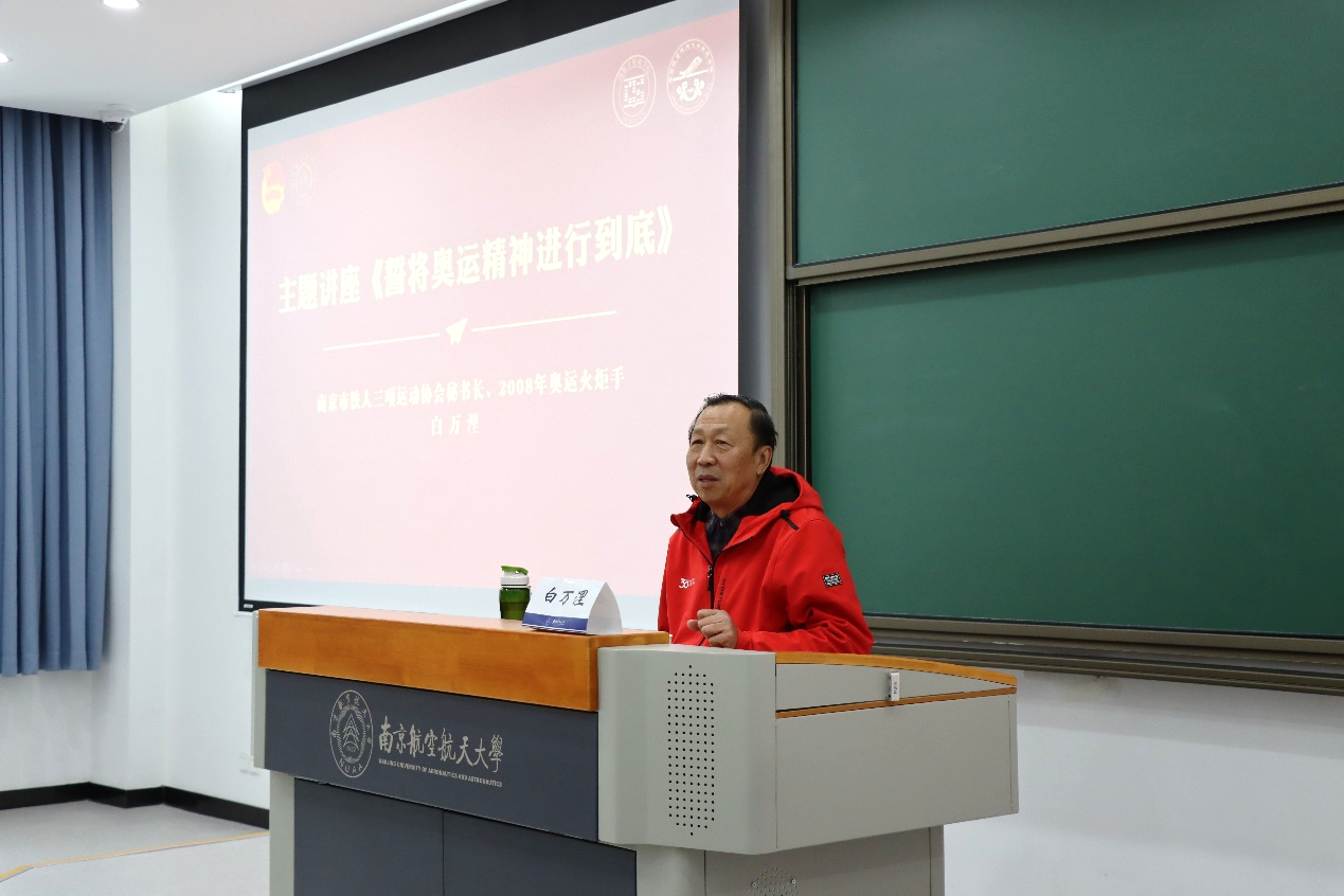 12月11日,电竞 和计算机科学与技术电竞 在天目湖校区牧星楼T2103教室联合举办“誓将奥运精神进行到底”信仰公开课。本次信仰公开课由南京市铁人三项运动协会秘书长、2008年奥运火炬手白万浬主讲,两电竞 辅导员及学生共同参加,活动由计算机电竞 辅导员胡朋主持。