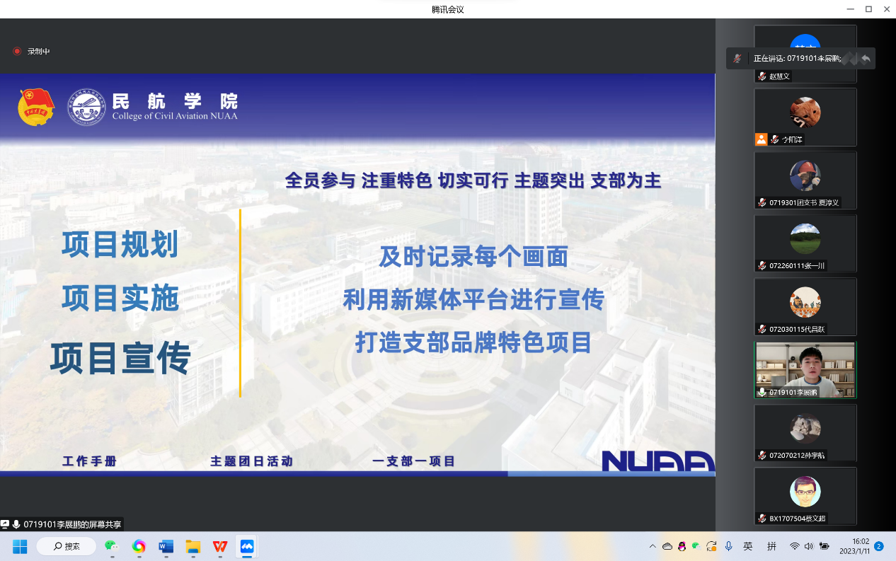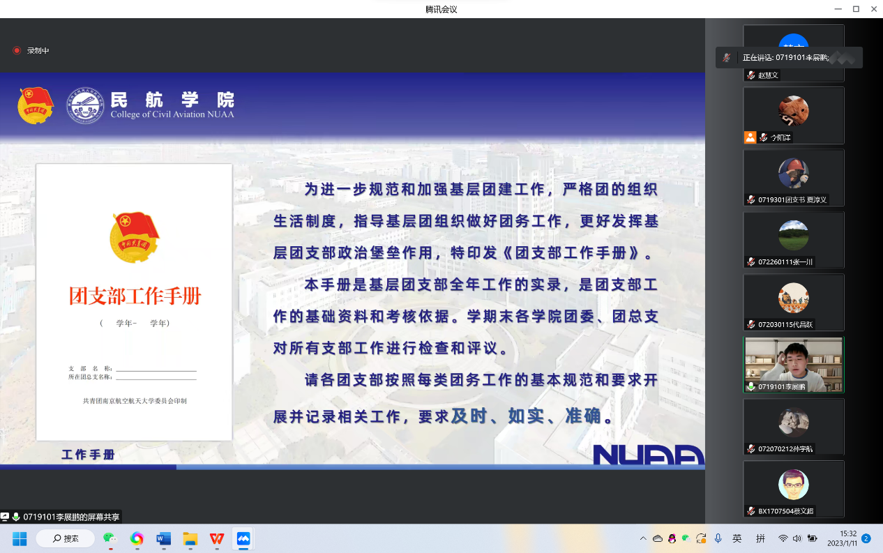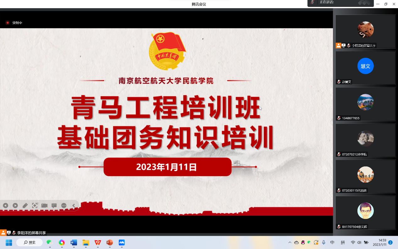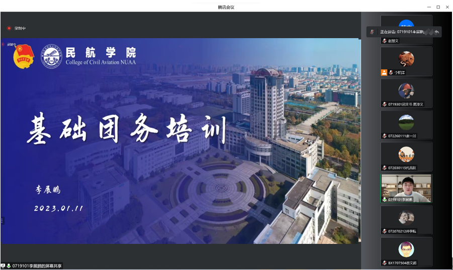 为提高基层团学组织骨干的理论基础和业务水平,进一步加强青年的思想政治引领,2023年1月11日下午,电竞 于线上开展青马工程培训班之基础团务知识培训。电竞 团委书记赵慧文、19级本科生优秀团干李展鹏、电竞 团委副书记李阳洋和全院团支书、团总支参与此次培训。