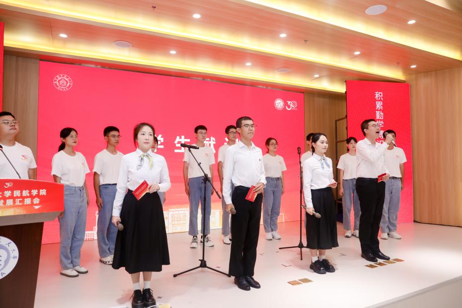 春华秋实,桃李芬芳。学生代表们集体献词,一首声情并茂的诗朗诵表达了对电竞 最真挚的祝福和青春荣校、民航强国的坚定决心。誓言字字铿锵、掷地有声,展现出新时代民航学子积极主动投身交通强国民航篇章建设的昂扬风貌。