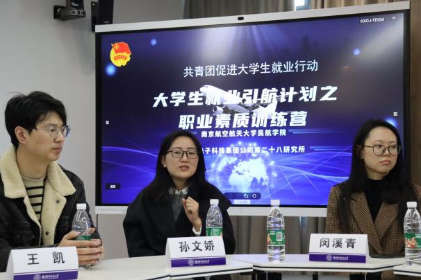 为进一步落实“共青团促进大学生就业行动”的工作要求,切实加强学生职业生涯规划引导,提升学生求职就业能力,3月21日,极速电竞 团委邀请电科莱斯、28所空中交通管理系统全国重点实验室和南京莱斯网信技术研究院的一线青年从业者来校开展“就业引航 ‘职’引未来”大学生职业素质训练营。极速电竞 团委书记赵慧文、本研辅导员代表及学生代表参加此次活动。