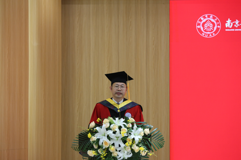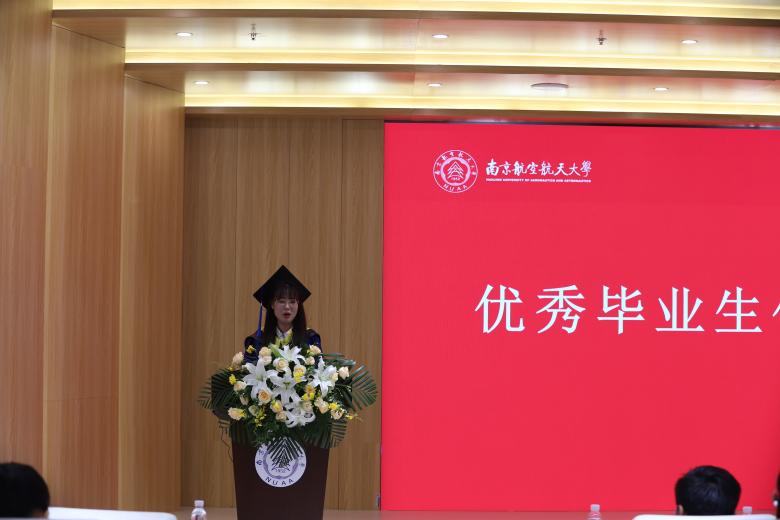 优秀毕业生冯慧琳代表全体2024届研究生向母院致以崇高的敬意,向传道授业的老师、相伴前行的同学和关心爱护的家长表达由衷的谢意,并表示将始终牢记智周万物、道济天下的校训,以强国情怀与民航精神为指引,让青春在全面建设社会主义现代化国家的火热实践中绽放绚丽之花。