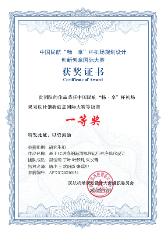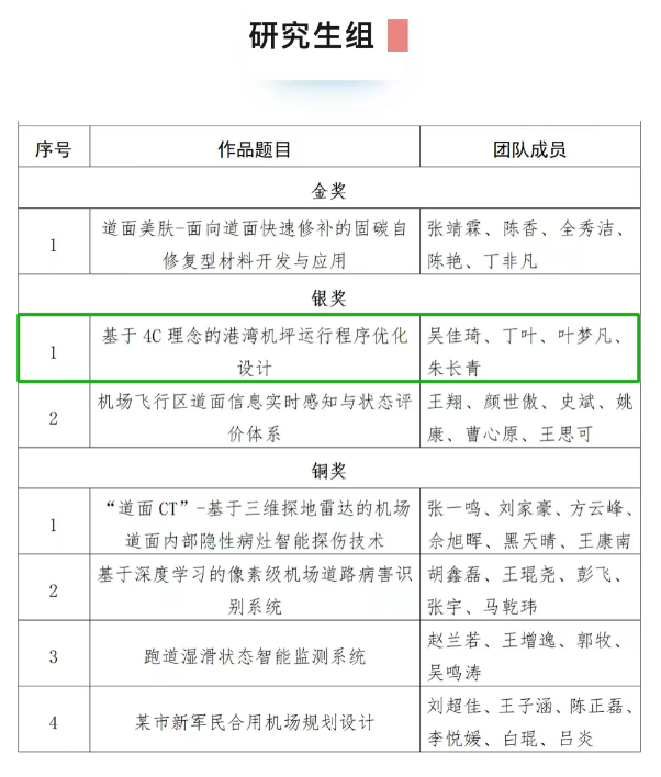 大赛自2023年3月正式启动以来,受到广泛关注和支持,收到了来自全国各高校、设计院、研究所及民航业内各单位等200支队伍的参赛作品。在历经了等级赛及初次评审后,团队作品“基于4C理念的港湾机坪运行程序优化设计”(指导教师:电竞 唐小卫、中国民航大学欧阳杰、上海浦东国际机场张瑞甲)在等级赛中荣获研究生组一等奖,与其他29支队伍一同入围精英赛,比赛过程中,学子们结合机场的实际需求和未来发展趋势开展规划设计,展示了扎实的理论知识和实践能力,最终荣膺精英赛研究生组银奖。