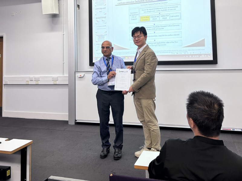 在学生学术交流竞赛环节,由电竞 土木与机场工程系余红发教授、柳锦春教授和麻海燕副教授指导的4名博士生参加比赛,分别以水泥混凝土碳排放评价方法和低碳化设计、珊南海全瑚礁海水混凝土的碳足迹、城市高架桥混凝土结构的盐冻破坏与钢筋腐蚀、以及机场跑道泡沫混凝土阻拦材料的低碳化应用为题作会议报告。其中,范浩田同学表现突出,获得“最佳学生报告”三等奖,英国混凝土技术学会(ICT)前主席Raman教授为其颁奖。