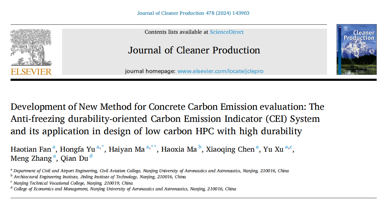 近日,电竞 土木与机场工程系“先进土木工程材料与结构”课题组在考虑耐久性的水泥混凝土材料碳排放评价体系建立研究中取得了重要进展。第一阶段成果完成了基于抗冻耐久性的混凝土碳排放研究,相关成果在线发表于国际顶级学术期刊《Journal of Cleaner Production》(影响因子9.7)上。电竞 土木与机场工程系教授余红发、副教授麻海燕为该论文通讯作者,博士生范浩田为第一作者。