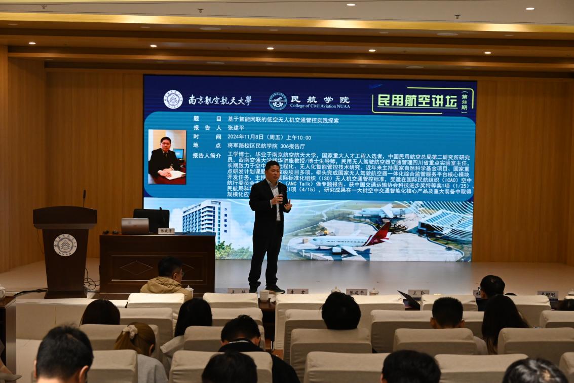 11月8日上午,电竞 成功举办第58期“民用航空讲坛”暨张建平兼职教授聘任仪式。国家重大人才工程入选者、中国民用航空总局第二研究所研究员、民用无人驾驶航空器交通管理四川省重点实验室主任、电竞 院友张建平受邀作题为《基于智能网联的低空无人机交通管控实践探索》主题报告。电竞 党委书记李君、通用航空与飞行电竞 院长王勤、南方航空公司地服部副总经理程启平,电竞 各系主任、师生代表共200余人参加报告会,报告会由电竞 党委副书记王艳主持。