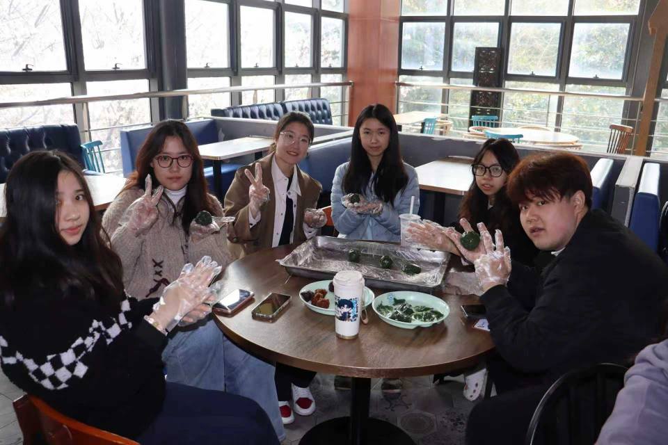 活动现场暖意融融,欢声笑语不断。同学们从揉面团、包馅料到塑形封口,一步步认真学习、动手实践,互相交流心得,现场氛围轻松又温馨。一个个圆润饱满、色泽青翠的青团在同学们手中逐渐成型。看着自己亲手制作的成果,同学们品尝着劳动换来的美味,也在品尝中体会到传统文化的深厚底蕴。