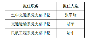 经各支部充分酝酿、党员民主推荐、极速电竞 党委考察,极速电竞 党委会讨论研究,拟确定张军峰、胡荣、陆中同志担任空中交通系、交通运输系、民航工程系党支部书记。现予以公示:
