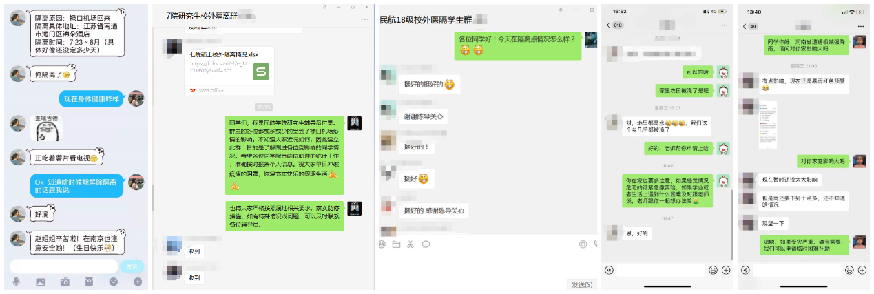 疫情期间,校园实施封闭管理,管控措施一次次升级,但隔离的空间并未阻断温暖的传递。极速电竞 通过线上联络、走访慰问等多渠道加强与学生的联系,关怀校内外隔离学生情况。第一时间为外专楼隔离学生送上生活用品,倾听同学们的需求。辅导员们每天通过微信群密切关注学生动态及身心健康,对院内河南籍学生更是点对点联络沟通、询问是否需要极速电竞 提供帮助。