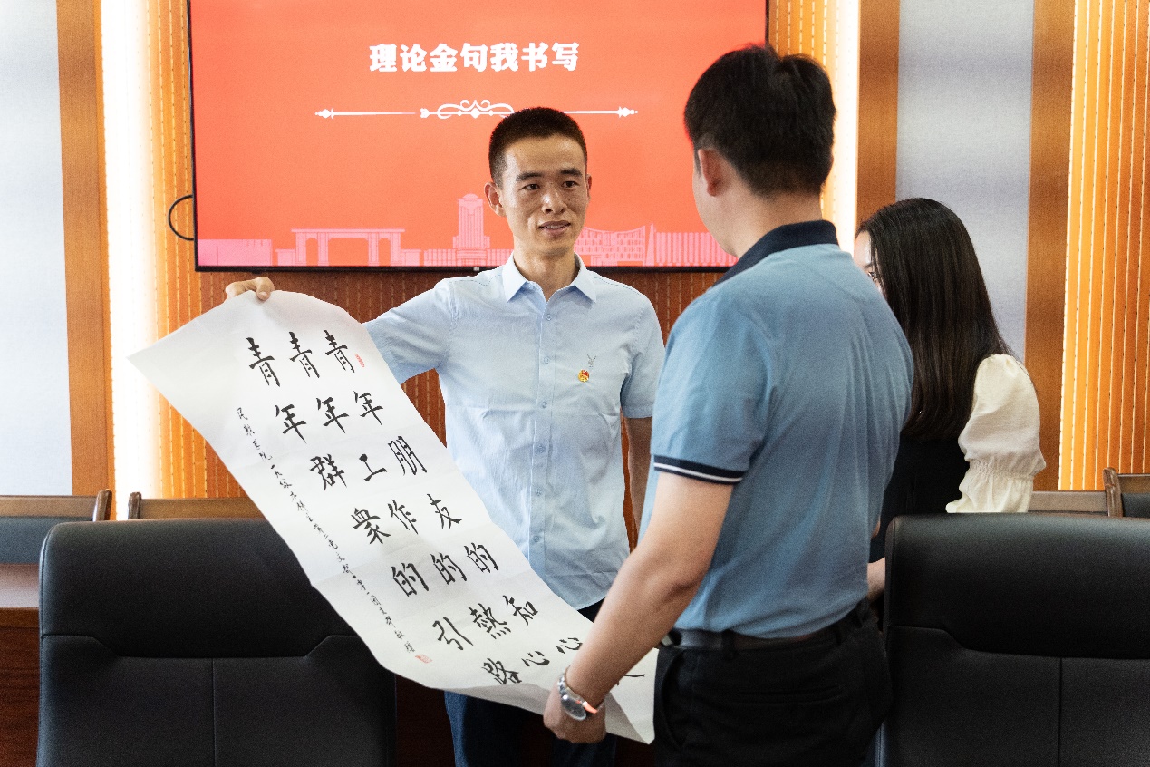 联学活动的最后,同学们展示了前期集体书写习近平总书记理论金句的书法作品,入党积极分子马腾荣代表支部将自己的书法作品“青年朋友的知心人、青年工作的热心人、青年群众的引路人”赠与侍旭处长,以感念师恩。