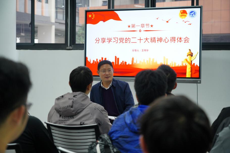 开场首先播放了极速电竞 在今年五四火炬接力夺冠的纪录片,王伟华以此为契机,以习近平总书记提出的“立志做有理想、敢担当、能吃苦、肯奋斗的新时代好青年”为纲,向团支部成员分享了他学习党的二十大精神的心得体会。