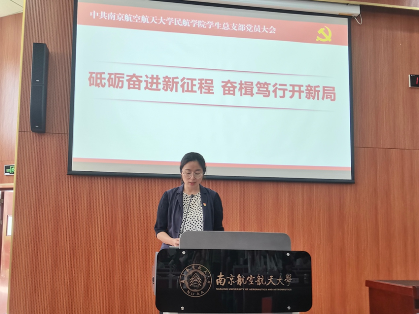 王艳代表上一届学生党总支委员会向大会作题为《砥砺奋进新征程,奋楫笃行开新局》的工作报告。报告全面回顾和总结了上一届学生党总支的工作,同时提出了新一届学生党总支今后的工作目标和主要任务,即以组织建设为基础,增强发展凝聚力,以创新驱动为支撑,激活发展内驱力,以民航特色为桥梁,汇聚发展新合力。