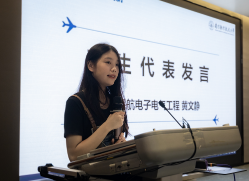 2023级本科新生黄文静作新生代表发言,她表示,作为新民航人要以实际行动接续民航精神的丰富内涵,勇于接过前辈们“民航报国”的接力棒,敢于“自找苦吃”,在大学探索自己的无限可能,寻找人生新的“航向标”。