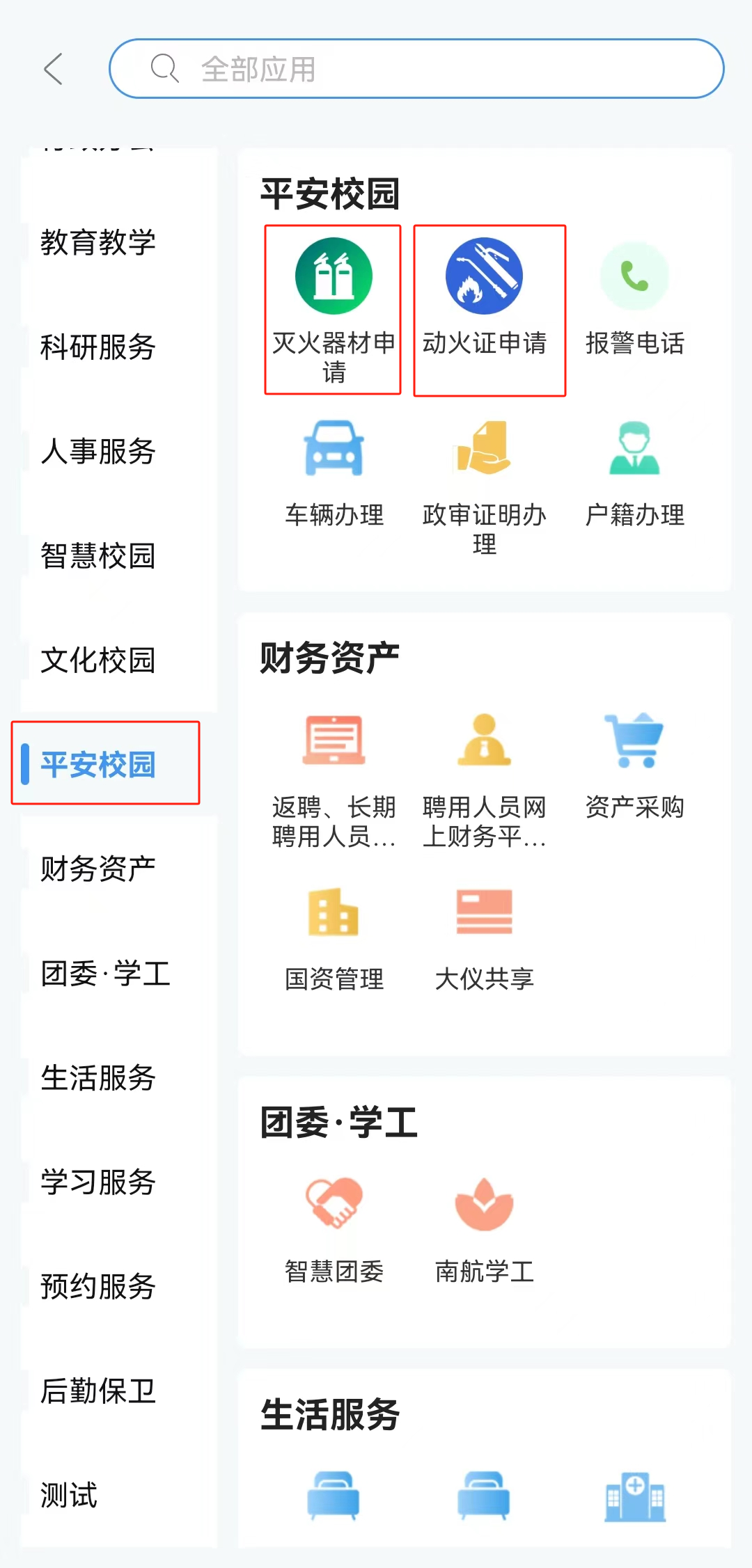 2.点击我的应用下面的“平安校园”,选择“灭火器材申请”或“动火证申请”。