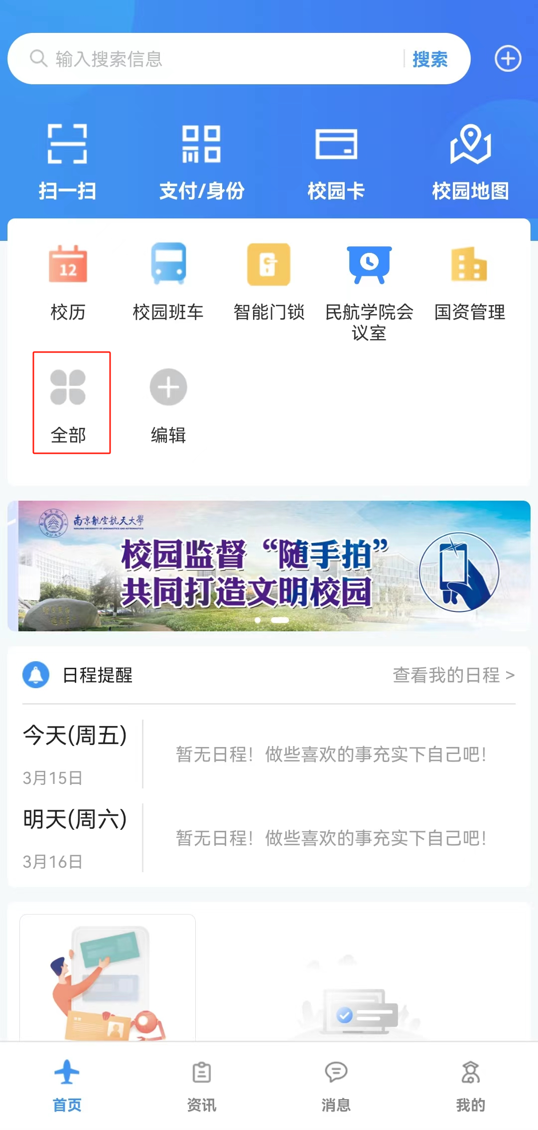 1.手机登录“i·南航”APP,点击电竞“全部”。