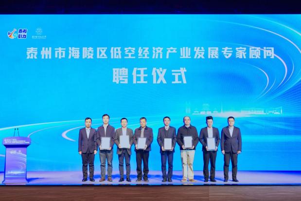 张卓然介绍低空经济产业科研成果。海陵区发布《低空经济产业项目落户指南》。施康振和施庆共同为南航低空经济专家代表颁发海陵区低空经济产业发展专家顾问聘书。