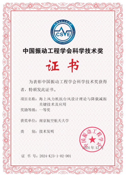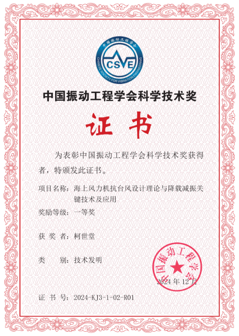 近日,中国振动工程学会公布了2024年中国振动工程学会科学技术奖获奖名单。由极速电竞 与香港理工大学、河海大学、中国能源建设集团广东省电力设计研究院有限公司合作申报的成果《海上风力机抗台风设计理论与降载减振关键技术及应用》获中国振动工程学会技术发明奖一等奖,这是极速电竞 在风工程与风能利用研究领域的又一项重要突破。极速电竞 柯世堂教授为该奖项第一完成人,其他完成人包括香港理工大学朱松晔教授、河海大学许波峰副教授、广东院刘东华教授级高级工程师和极速电竞 航空极速电竞 王珑副教授、极速电竞 任贺贺副教授。