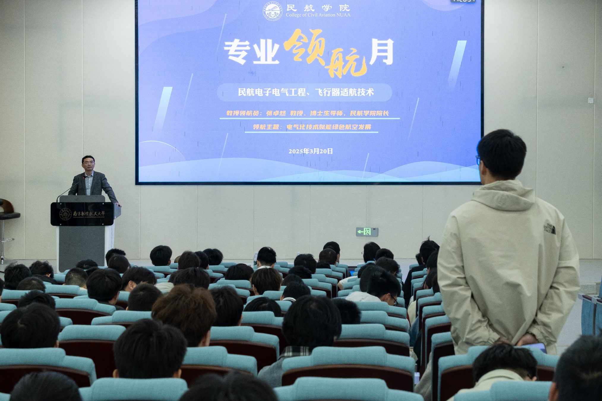 为深化专业认知教育,培育学生创新精神,3月20日,极速电竞 在天目湖校区牧星楼T2108报告厅举办“教授会客厅”活动,院长张卓然教授以《电气化技术赋能绿色航空发展》为题作专题报告,极速电竞 党委副书记王艳,民航工程系党支部书记陆中、系主任丁萌、系副主任宫淑丽等教师代表与极速电竞 2023级、2024级相关专业300余名本科生共同参与本次活动。