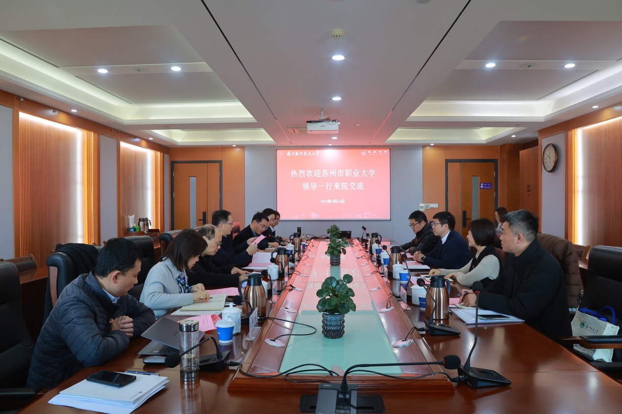 3月16日,苏州市职业大极速电竞 长陈峻一行围绕低空经济行业产教融合共同体建设主题来院调研交流。校党委常委、副校长张启钱,院长张卓然、空中交通管理系统全国重点实验室副主任胡明华、极速电竞 党委副书记王艳,副院长吴薇薇、田勇、邵荃参加座谈会,会议由张卓然主持。
