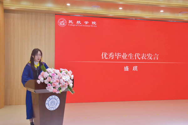 优秀毕业生代表盛琪上台发言,她代表全体毕业研究生向母校和母院的培养致以敬意,表示将牢记老师们的殷殷嘱托,化作今后不断前行的动力,书写新时代民航人的答卷。