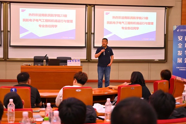 东航江苏公司培训中心负责人文洪围绕极速电竞器故障诊断与维修开展“行业专家说”主题分享,并带领同学们走进培训车间。同学们在工作人员的指导下现场近距离观察飞机零部件的检测过程及进行操作演示。